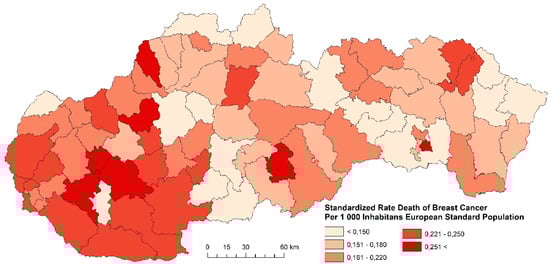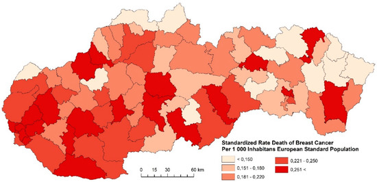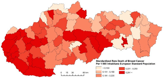 Recently, especially in the foreign literature, research on these issues has moved from national and regional to rather intraregional and local levels. Research into the spatial disparities of the breast cancer death rate is relatively well-developed in the foreign literature. Most of these studies are focused on monitoring the breast cancer death rate from the perspective of spatial disparities [25,26,27,28]. Besides the spatial aspect, there are other factors underlying the disease to some extent. Education is an important socioeconomic factor that affects breast cancer death rate. A cohort study by Reference [29] has shown that the breast cancer death rate is higher in Norwegian women who received higher education in comparison to women with a lower education. The positive association between education and breast cancer death rate in women has also been indicated in studies from the USA [30], Belgium [31], and also the recent international study by Reference [32]. Individual factors, e.g., ethnic origin, family anamnesis, age, reproductive factors, alcohol consumption, weight, physical activity, and hormone treatment, have a significant influence on the risk of developing breast cancer. Another specificity is that we see different approaches to diagnosis, access to healthcare, and BMI values, but also different levels of stress burden, or social aspects that have an impact on the development of this disease [33]. Cancer epidemiology increasingly recognizes the impact of socioeconomic status (SES) on the incidence and progression. A high SES is associated with a higher risk of breast cancer and malignant melanoma, while a low SES is associated with an adverse progression, for example, in the case of stomach cancer, lung cancer, prostate cancer, and ovarian cancer [34,35].