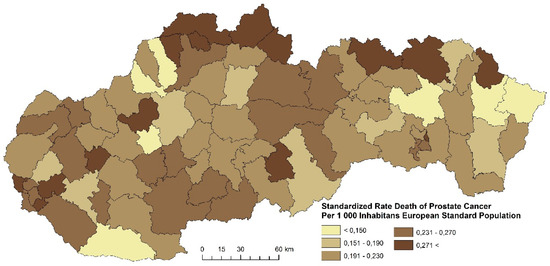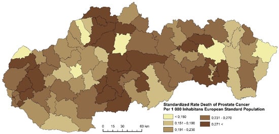 - Kažmer, L.; Križan, F. Spatial distribution of prostate cancer mortality in Slovakia districts during the period 1996-2007. Acta Geogr. Univ. Comen. 2010, 54, 101–118. [Google Scholar]