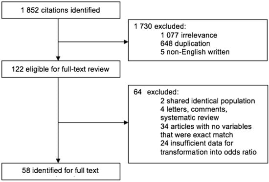 A total of 1852 potentially relevant articles were identified from the electronic database. Then, 1730 articles were excluded on the basis of the selection criteria. Subsequently, 64 articles were excluded due to shared identical population (n = 2), systematic review (n = 4), no available variables (n = 34), and insufficient data for the computation of the odds ratio (OR) (n = 24). A total of 202 records from 58 articles were retained for the meta-analysis, as shown in Figure 1.