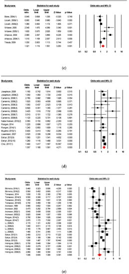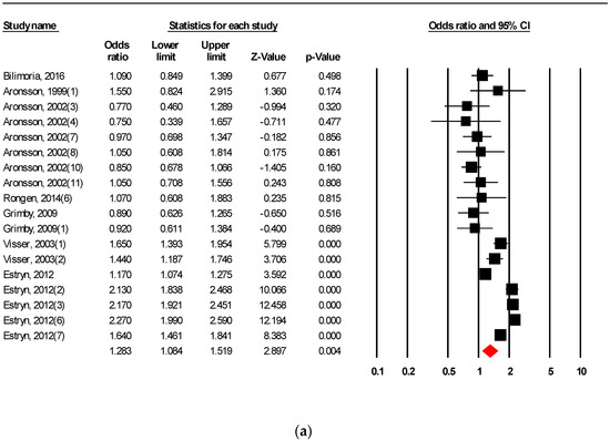 The aggregated odds ratio for the relationship between WLBA and OP was 1.181 (95% confidence interval (CI): 1.125–1.240, p < 0.001). WLBA was significantly associated with ET (OR: 1.357; 95% CI: 1.180–1.561; p < 0.001), EC (OR: 1.321; 95% CI: 1.119–1.561; p = 0.001), CA (OR: 1.283; 95% CI: 1.084–1.519; p = 0.004), and EA (OR: 1.195; 95% CI: 1.124–1.271; p < 0.001). WLBA was non-significantly associated with PR (OR: 1.139; 95% CI: 0.961–1.351; p = 0.134) and OC (OR: 1.046; 95% CI: 0.835–1.309; p = 0.696). The forest plots of aggregated studies grouped by OP are illustrated in Figure 2a–f.