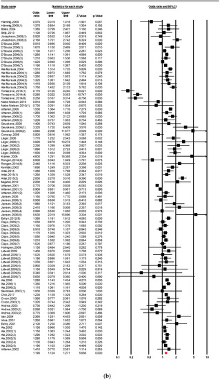 The trim-and-fill method was used to test and adjust the publication bias in the meta-analysis and estimate the number of “missing” or unpublished studies through testing for the asymmetry of the funnel plot [70]. New data points were added to the adjustment of publication bias for CM (n = 4, OR: 1.422; 95% CI: 1.215–1.664), EA (n = 23, OR: 1.046; 95% CI: 0.978–1.101), ET (n = 4, OR: 1.481; 95% CI: 1.278–1.716), and PR (n = 11, OR: 0.899; 95% CI: 0.756–1.069). No new data points were added to the adjustment of the publication bias for EC and OC.