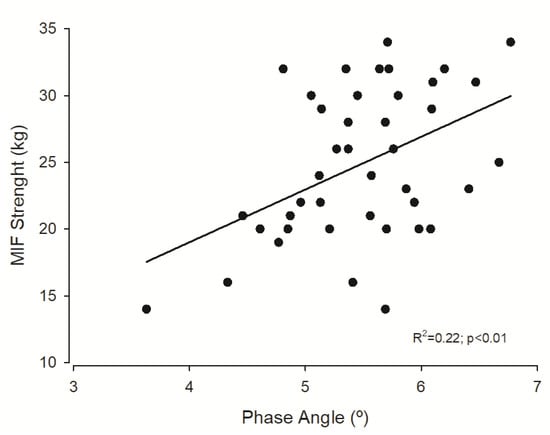 Regression plot of phase angle and maximal isometric forearm (MIF) strength.
