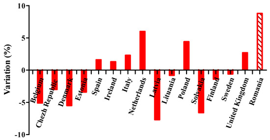 From the data presented by Directorate c–Public Health in the European Commission–Health and consumers directorate-general [15,23], it can be observed that the percentage of diabetes funds in the total health expenditure differs greatly from country to country. Figure 1 shows the variation of this share in 2011 compared to 2007, in 16 EU countries. From all these countries, the best evolution was for Romania, from 2.0% to 10.8% (+8.8%), where the share of DM in the health budget increased more than 4 times.