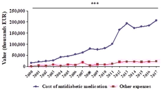 The total cost of antidiabetic drugs had mean values of 96,045 ± 67,889 thousand EUR and other expenditure had mean values of 11,530 ± 7,922 thousand EUR. In 2000–2017, the average share of other cost expenditures in DMF was 13.0% (minimum: 4.6% in 2008; maximum: 30.6% in 2003). There is a very good, directly proportional correlation, with statistical significance (r = 0.945, *** p < 0.001) between the total cost of antidiabetic drugs and other expenditures (Figure 3).
