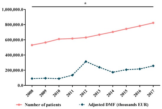 Evolution of the number of patients compared to the adjusted value of DMF (thousand EUR) (r = 0.73, * p = 0.016).