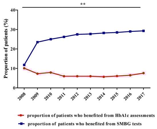 Evolution of the number of patients who benefited from HbA1c assessments or SMBG tests (adults and children) (r = −0.781, ** p = 0.008).