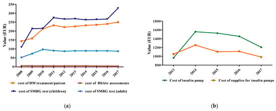 Efficiency indicators (EUR): (a) cost of DM treatment/patient/year (EUR), cost of HbA1c assessments (EUR), cost of SMBG test for children (EUR), cost of SMBG test for adult (EUR), (b) cost of insulin pump (EUR), cost of supplies for insulin pumps (EUR).