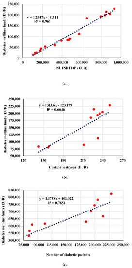 The data above show that during the last ten years of the study, the amounts spent with DM increased together with the number of patients benefiting from health care; the quality of services furnished increased as more doctors and better trained personnel joined this effort. Following free of charge self-monitoring, HbA1c assessments or insulin pumps, new suppliers with higher quality products entered the market. All these prove that the funds allocated to DM were used both to supply medication and materials for the treatment and monitoring of the disease for a larger number of patients, as well as the fact that the services provided had a higher cost and also a better quality. Nowadays, the economic evaluation is more and more common for various treatments [52]. The correct treatment administered in time is the main condition for the diabetic patient’s health, being essential for the prevention of the diabetes mellitus complications. A bad patient condition may require extra care or hospitalization [53,54,55], and also, it can also lead to early retirement or even early mortality. All these represent additional expenditures from the budget of social insurance.