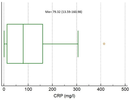 The medians of analyzed biomarkers for the entire study population were CRP 79.32 (IQR 13.59–160.98), NGAL 85.94 (IQR 47.85–145.92), NSE 7.04 (IQR 3.40–10.39), S100B 0.038 (IQR 0–0.415), MMP-9 172.00 (IQR 93.00–274.20), and TIMP-1 223.60 (IQR 193.10–313.50), respectively, Figure 1, Figure 2, Figure 3, Figure 4, Figure 5 and Figure 6.