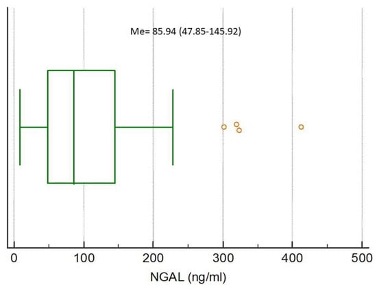 Distribution of the neutrophil gelatinase-associated lipocalin (NGAL) concentrations in the study population. Circles indicate outliers and far out values illustrated as single data points.