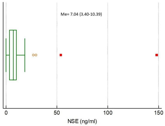 Distribution of the neuron-specific enolase (NSE) concentrations in the study population. Circles and squares indicate outliers and far out values illustrated as single data points.