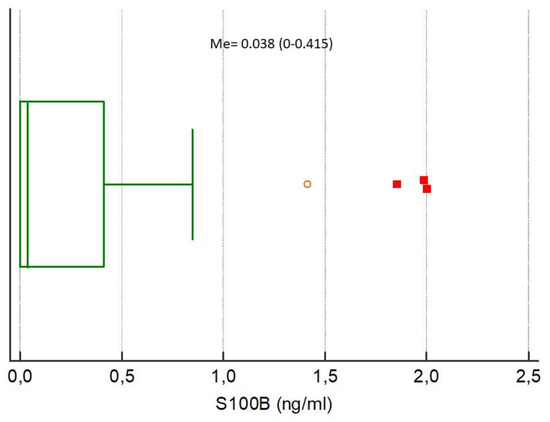 Distribution of the S100 calcium-binding protein B (S100B) concentrations in the study population. Circles and squares indicate outliers and far out values illustrated as single data points.