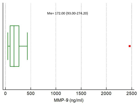 Distribution of the matrix metalloproteinase 9 (MMP-9) concentrations in the study population. Squares indicate outliers and far out values illustrated as single data points.