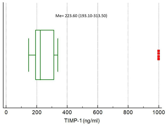 Distribution of the tissue inhibitor of metalloproteinase 1 (TIMP-1) concentrations in the study population. Squares indicate outliers and far out values illustrated as single data points.