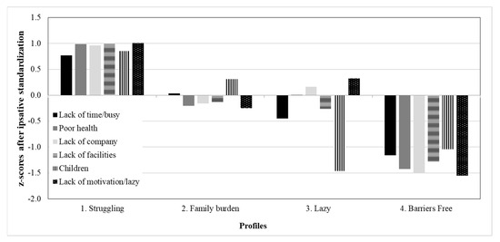 Parents in profile 4 were labelled as “Barriers free”. Compared to the sample mean, these parents reported all six challenges which stopped them from doing PA at extremely low frequency, being very much below the average (SDs < −1.07). These parents may experience all challenges minimally.