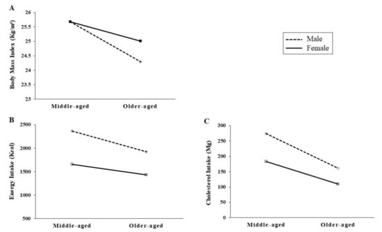 Interaction effects of gender and age on BMI (A), energy (B) and cholesterol intake (C).