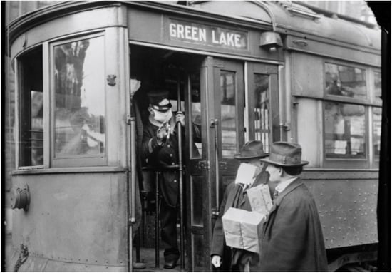 In September 1918, the second, and most deadly, wave of the pandemic emerged within the United States [21]. Soldiers at Camp Devens, an army training camp just outside of Boston, Massachusetts, and sailors aboard the Receiving Ship at Commonwealth Pier in Boston began reporting flu-like symptoms [16,22]. By month’s end, more than 14,000 cases were reported at Camp Devens, approximately one-quarter of the total camp, and 757 soldiers succumbed to influenza [16]. The Massachusetts Department of Health informed local newspapers of the epidemic and stated that, “unless precautions are taken the disease in all probability will spread to the civilian population of the city” [22]. At the nearby Navy Radio School within Harvard University in Cambridge, Massachusetts, cases of influenza were reported among the group of 5000 young men studying radio communications. As 1918 concluded, Cambridge experienced 3014 cases of influenza among its meager population of 109,000 residents, ultimately leading to a mortality rate of 541 per 100,000 [23]. During this time in New York State, the Board of Health in New York City, added influenza to the list of reportable diseases, and required all cases to be isolated at home or in a city hospital [16]. Moreover, in a document entitled “Fighting Influenza with Transit Systems”, the Board of Health adopted a plan to set operation schedules for many business, which would then elongate the time window for transit service and reduce congestion [24,25]. In lieu of subway suspension, Royal Copeland, the City Health Commissioner “staggered workdays by industry, so that instead of everyone arriving at work at 9:00 [am], some were to come in later or earlier” [26]. Other cities, such as Seattle, Washington, followed suit in controlling the transmission of influenza within public transit environments by requiring passengers to wear face masks before boarding streetcars (Figure 1) [27].