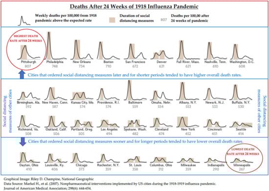 - Strochlic, N.; Champine, R.D. How Some Cities ‘Flattened the Curve’ During the 1918 Flu Pandemic—March 27, 2020. National Geographic. Available online: https://www.nationalgeographic.com/history/2020/03/how-cities-flattened-curve-1918-spanish-flu-pandemic-coronavirus/#close (accessed on 24 April 2020).