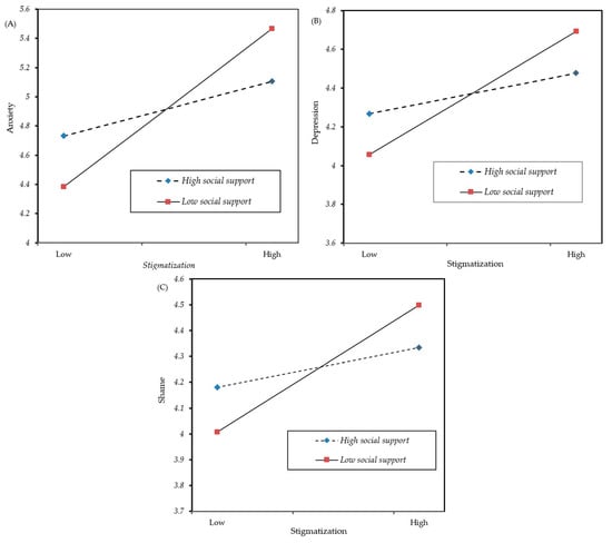 Table 4 shows the results of relationships between stigmatization and anxiety, depression, and shame at high (+1 SD) and low level (−1 SD) of social support. The results showed that the effects of stigmatization on anxiety, depression, and shame were significantly weaker at high-level (+1 SD) social support (Estimate = 0.134, 0.075, and 0.055, p < 0.01, 0.01, and 0.05) than that at low-level (−1 SD) social support (Estimate = 0.390, 0.229, and 0.177, p < 0.01; z = −0.257, −0.154, −0.122, p < 0.01). The analysis results above were also displayed in Figure 1. Using Cohen, Cohen, West, and Aiken’s (2003) method [42], we plotted the interaction at high (+1 SD) and low level (−1 SD) of social support. As shown in Figure 1, when social support was higher, the relationships between stigmatization and anxiety, depression, and shame were weaker.