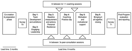 The leadership development program consisted of three phases: (a) co-creation; (b), intervention or execution; and (c) evaluation and sustainment [10,51]. Figure 1 schematically displays the structure and content of the program. The initiation and co-creation phase of the program took two months. The structure, operational details, and parameters for success were discussed with the team leaders and their supervising manager, the senior leadership team, and the global department head, who also initiated the program. Actively involving the team leaders in the design phase of the project mirrored the preferred leadership style that the department sought, which was reflected in the department’s slogan for the project: “Co-creating a great place to work.” Consequently, co-creation continued during the months of the intervention. The trainers remained in close contact with the global department head, his team, the supervising manager, and the participating team leaders. The team members were not involved in co-creation nor would they participate in the leadership development program’s training sessions. Team members were asked to complete an online survey, to which their team leaders personally invited them. The program was launched with the pre-test survey to establish a baseline and unfolded eight months, after which the T1 follow-up survey was administered.