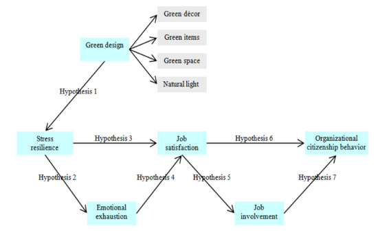 Our finding indicated the significant mediating role of stress resilience, job satisfaction and job involvement within the hypothesized theoretical framework. These results are consistent with prior studies highlighting the importance of these constructs as mediators [37,40,41]. Our results imply that stress resilience, job satisfaction and job involvement acted as vital factors, because they maximized the effect of their antecedents on their outcome factors. Theoretically, the proposed framework helped us elucidate the role of the critical distal predictors of organizational citizenship behavior. Recognizing the crucial contribution of stress resilience, job satisfaction and job involvement, hotel proprietors should deal with the mediation factors to take full advantage of the influence of hotel green design to escalate the organizational citizenship behavior that eventually results in the successful operation of the hotels.