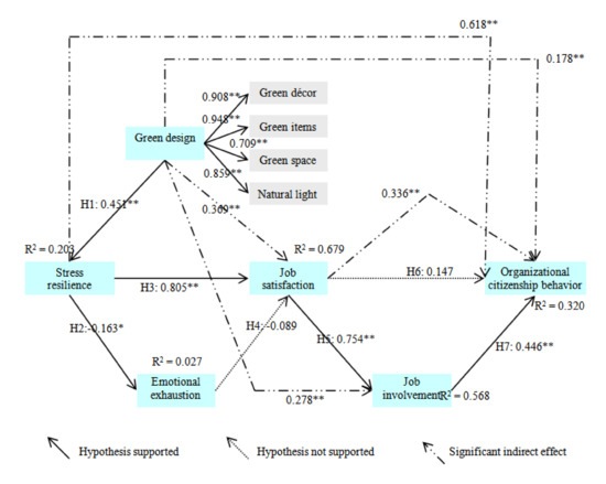 The hypothesized linkage between the green design and the stress resilience was tested. Our result revealed that the green design had a significant effect on the stress resilience (β = 0.451 and p < 0.01), thus supporting hypothesis 1. Stress resilience was found to exert a significant effect on emotional exhaustion (β = −0.163 and p < 0.05) and job satisfaction (β = 0.805 and p < 0.01). Therefore, Hypotheses 2 and 3 were also supported. The emotional exhaustion was not found to significantly affect job satisfaction (β = −0.089 and p > 0.05), thus rejecting hypothesis 4. Job satisfaction was found to significantly affect job involvement (β = 0.754 and p < 0.01). Yet, its effect on organizational citizenship behavior (β = 0.147 and p > 0.05) was not significant. Hence, hypothesis 5 was supported, but hypothesis 6 was rejected. Lastly, job satisfaction was found to have a positive effect on organizational citizenship behavior, thus supporting the hypothesis.