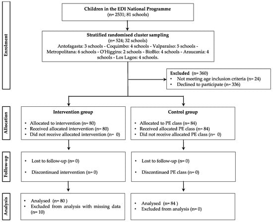 Of the 2531 children who participated in the EDI programme of the National Sports Institute of Chile, a representative sample was determined, and a sample of 524 children was obtained (confidence level 99%; margin of error 5%; population proportion of 50%). For this quasi-experimental study, stratified cluster sampling was carried out to determine the schools to be evaluated (Table S1). The schools were assigned following simple randomization procedures through the “RandBetween” function of Microsoft® Excel® (Office 365®, Redmond, WA, USA), from the 81 schools in the programme. From a total of 81 participating schools, the sampling yielded a total of 32 schools distributed in eight regions of the country (Antofagasta, 3 schools; Coquimbo, 4 schools; Valparaíso, 5 schools; Metropolitana, 6 schools; O’Higgins, 2 schools; BioBio, 4 schools; Araucanía, 4 schools and Los Lagos, 4 schools). A total of 32 schools were assessed according to the chosen representativeness criteria. The participants’ eligibility criteria were as follows: regularly attending programme sessions or physical education classes (PE session); aged between 6 and 12 years; and not belonging to any competitive sports team. Information was collected from children of these schools via a questionnaire on PA and active behaviour, as well as via an assessment of body composition and a test of motor coordination and agility. From the original sample, 24 were excluded for not meeting the age inclusion criteria (>12 years old), and 336 declined to participate. Finally, 164 children agreed to take an accelerometer with them during the school day, according to the protocol established. The intervention group sample (participants of the programme) consisted of 80 participants (6–12 years old), of which only 70 children (51 boys and 19 girls) obtained valid accelerometer data. Ten children who did not use the device or who used it for less than 8 h/day were excluded from the study. A total of 70 children were considered in the analysis.