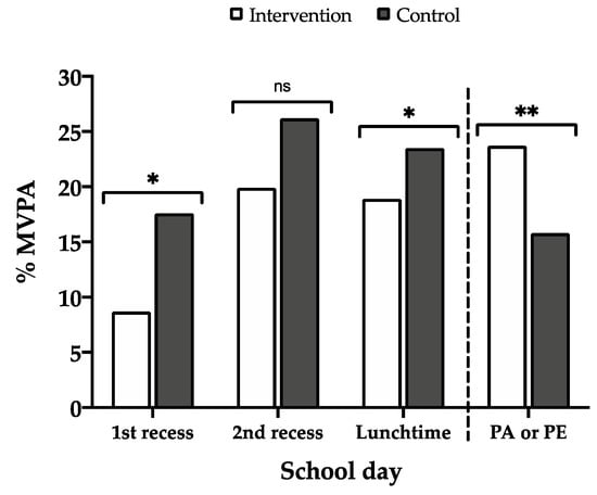 Percentage of MVPA during recess, lunchtime and the PA session/PE session for the intervention and control groups. The symbols correspond to * p < 0.05; ** p < 0.001; ns: no significant difference.
