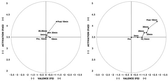 2D circumplex model (average FAS and FS of all participants) Note. Left: 1st experiment/Right: 2nd experiment. FAS: felt arousal scale; FS: feeling scale.