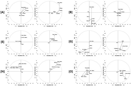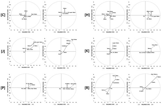 In addition to the above participants, eight other participants were found to have experienced a positive psychological influence from the aromatherapy. They said they did not have any psychological or physical concerns that would be relevant to the results of this study before the first and second experiment. Data from in-depth interviews with similar content were omitted. The 2D circumplex models of these participants (C, H, J, K, P, R) are shown in Figure 3.