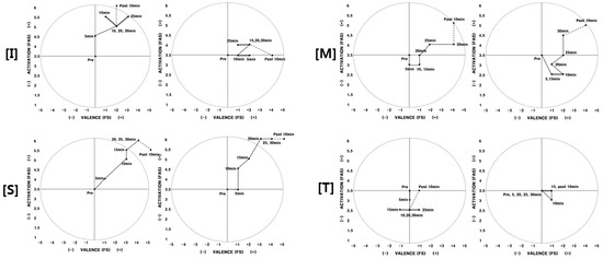 2D circumplex model (participants I, M, S, T) Note. Left: 1st experiment/Right: 2nd experiment. FAS: felt arousal scale; FS: feeling scale.
