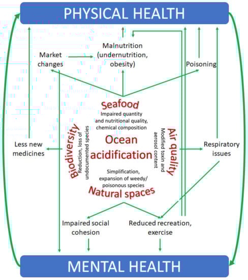 Ocean acidification is predicted to negatively affect four of the main services provided by the ocean (seafood, air quality, natural spaces, and marine biodiversity). All of these services are linked to physical and mental health through interconnected direct and indirect pathways.