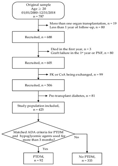 Flowchart of patient inclusion process. ADA: American Diabetes Association; CsA: cyclosporine; FK: tacrolimus; PNF: primary non-function; PTDM: post-transplant diabetes mellitus.