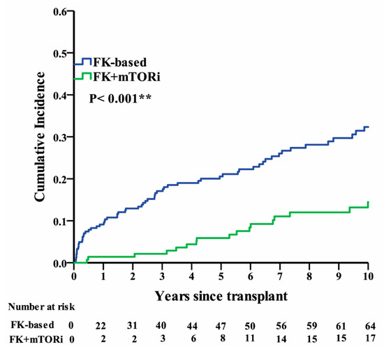 The multivariable logistic regression analyses revealed that age (p < 0.001), BMI (p < 0.001), donor source (p < 0.04), and tacrolimus use (p < 0.001) were independent risk factors for PTDM (Table 3). The risk of developing PTDM in recipients aged 45–65 years at the time of transplant was 2.9 times higher than that in patients aged <45 years (aOR = 2.90, 95% confidence interval (CI) = 1.64–5.13), and the risk in patients aged >65 years was 4.86 times higher than that in patients aged <45 years (aOR = 4.86, 95% CI = 1.5–15.79). The risk of developing PTDM in recipients with BMI 24–27 and >27 kg/m2 was 2.96 times (aOR = 2.96, 95% CI = 1.52–5.75) and 5.25 times (aOR = 5.25, 95% CI = 2.75–10.42) higher than that in patients with BMI < 24, respectively. The risk of developing PTDM in patients who received cadaveric donor renal transplants was 2.01 times higher than that in patients who received living-patient renal transplants (OR = 2.01, 95% CI = 1.03–3.93). Furthermore, the risk of developing PTDM in recipients of tacrolimus-based IMRs was 3.57 times higher than that in patients receiving the tacrolimus-based + mTORi regimen (OR = 3.57, 95% CI = 0.14–0.55). Finally, the cumulative incidence of PTDM in recipients of tacrolimus-based IMRs was significantly higher than that in patients receiving the tacrolimus-based + mTORi regimen (p < 0.001; Kaplan–Meier analysis; Figure 2).