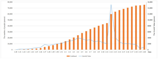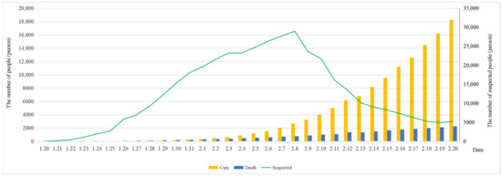An epidemic of the novel coronavirus disease 2019 (COVID-19) broke out in Wuhan City, Hubei Province, China, in early 2020, and spread rapidly in China and across the world, causing tens of thousands of people to be infected with the virus. On 21 January, the prevention and control of the epidemic sprouted at the national level, and many provinces in China launched the first-level emergency response of epidemic prevention. By 30 January, more than 7000 COVID-19 infection cases had been confirmed in China and more than 50 cases had been confirmed in countries and regions outside China, so the World Health Organization (WHO) had declared the outbreak of the novel coronavirus in China as a public health emergency of international concern (PHEIC). According to the latest data (http://www.nhc.gov.cn/) released by the National Health Commission of the People’s Republic of China, it can be seen from Figure 1 that the number of confirmed cases increases in an S-shaped trend. Although the cumulative number is rising, the number of newly confirmed cases reached an inflection point, reaching the peak on 4 February and then gradually decreasing. The number of newly confirmed cases rose excessively on 27 January due to the increase in the number of institutions with the capacity of pneumonia detection. Figure 2 demonstrates that the number of suspected cases rose until 8 February and then decreased, while the number of deaths slowly increased and reached 2239 in total on 20 February. Moreover, the number of cured patients significantly increased and reached 18,278 on the same day. On 11 February, the new coronavirus disease was officially named coronavirus disease 2019 (COVID-19) by the WHO. The International Committee on Taxonomy of Viruses (ICTV) named the virus strain as severe acute respiratory syndrome coronavirus 2 (SARS-CoV-2).