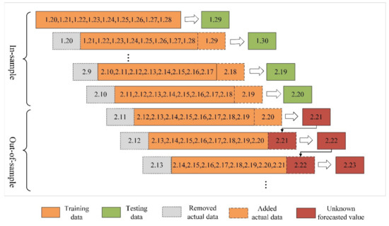 The traditional grey Verhulst model and its derived model established by the original data sequence are used to predict the next value . By supplementing the value into the original sequence and removing the earliest data point , a new sequence, , is formed. This sequence is taken as the original sequence used to build the model, and the above steps are repeated for prediction and supplementation one by one. The models established according to the above steps are the grey rolling Verhulst model and its derived model. The length of the rolling sequence is expressed as . When is 9, the rolling modeling process of the two models is shown in Figure 4. This model can make good use of new information and obtain more accurate predicted results.