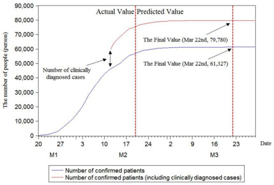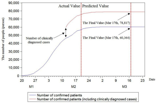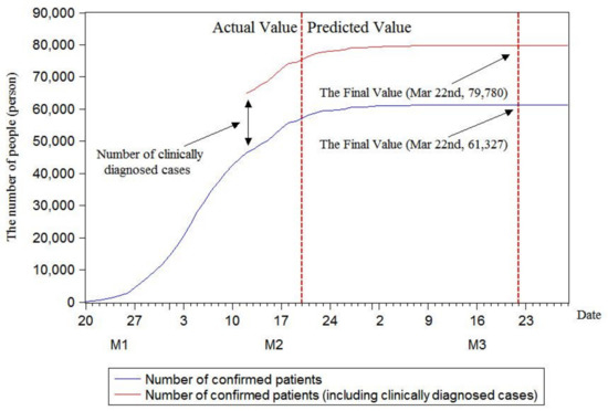 On 13 February, Hubei Provincial Health Commission announced on its official website that, to be consistent with the case diagnosis and classification issued by other provinces in China, the province would release the number of clinically diagnosed cases and include this number in the confirmed cases. Since then, due to the appearance of clinically diagnosed cases, the number of confirmed patients increased greatly every day. Therefore, this study predicted changes of the number of confirmed patients with and without consideration of clinically diagnosed cases. This research further calculated out-of-sample prediction accuracies on 21 and 22 February to verify the predictive ability of the models. The results of final predicted values are demonstrated in Table 5. It was found that the three models could accurately predict out-of-sample data; the specific data are presented in Table 6.