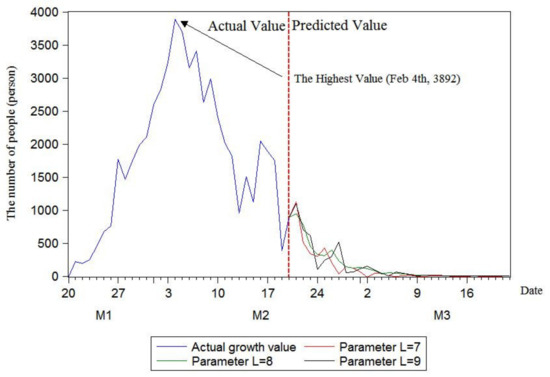 As shown in Figure 8, the inflection point had appeared on 4 February, with the number of confirmed patients of 3892. In addition, the growth in single days declines rapidly, and the predicted results of the three models are basically the same, which proves that the results are robust.