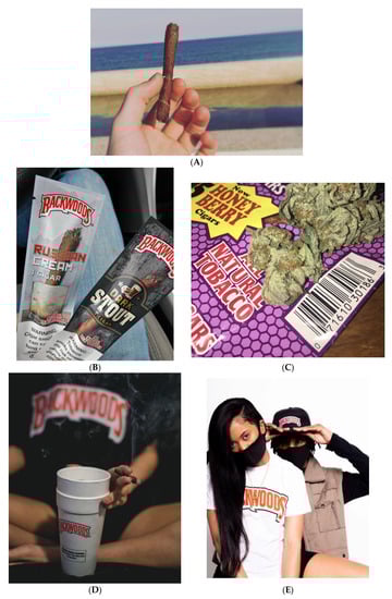 - Allem, J.P.; Escobedo, P.; Chu, K.-H.; Boley Cruz, T.; Unger, J.B. Images of Little Cigars and Cigarillos on Instagram Identified by the Hashtag #swisher: Thematic Analysis. J. Med. Internet Res. 2017, 19, e255. [Google Scholar]