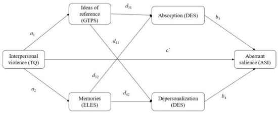 In this context, it makes sense for ideas of reference (IRs) to emerge as a form of social cognition [21], due to their relationship with situations perceived as threatening. As IRs take place in normal functioning, in populations with at-risk mental states and in clearly pathological functioning [21], they fit in with a time when interpersonal susceptibility is triggered, although it is still a very unspecific and little-developed process [42]. The permanence of this state of alarm, particularly the persistence of IRs, is what is usually related to psychotic processes [43]. Although this design cannot ensure continuity in the presence of IRs, it is nevertheless true that the relationship with situations involving violence is solid, and it is not disregarded that such situations are repeated or that they maintain their effect. IRs and memories of the relationship with one’s parents (ELES) are related sequentially with the dissociative response (absorption and depersonalization), more clearly in the case of IRs, as observed previously [25]. Both forms of dissociation were significantly related to aberrant salience (PLE), and therefore, this confirmed hypothesis 2.