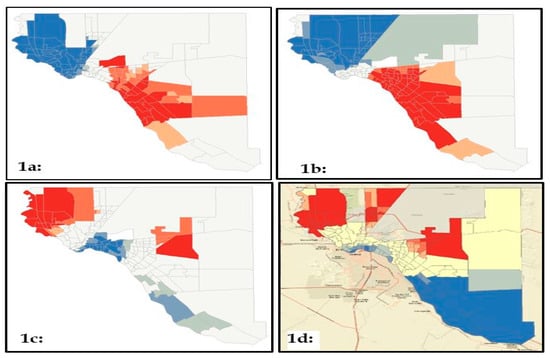 To better understand how Hispanic ethnic concentration, obesity, median income, and high school graduation prevalence might coexist in a community that is largely Hispanic, hotspot analysis was conducted to assess for significant clusters within the El Paso County; these results are displayed in Figure 1. Hot, or significant higher averages are in red, and the cold spots are in blue. The more significant the hotspot is, the darker the color. These hotspots were generated to determine if significant overlapping patterns were present between obesity prevalence (Figure 1a), Hispanic ethnic concentration (Figure 1b), and with census tract median income (1c) and high school graduation prevalence (1d), based on the changes observed in the geographically weighted regression analysis. In all cases, statistically significant hot and cold spots were identified and can be viewed in Figure 1. Obesity had one large, significant cold spot on the westside of the county and one large hotspot on the central-eastside of the county (see Figure 1a). Similarly, there was a large cold spot in the westside and a large hotspot in the central eastside for the Hispanic ethnic concentration (see Figure 1b). Median income hotspot analysis (Figure 1c) revealed two significant hotspots—one in the west side and one in the east central areas of the El Paso County. There were also two significant cold spots. The first was located in the central area of the county and the second was located in the far east (see Figure 1c). Finally, high school graduation (see Figure 1d) yielded three hotspots—one in the westside, one in the northeast and one in the eastside. In sum, the Hispanic ethnic concentration hotspot corresponded almost directly to the obesity hotspots for the El Paso County. While there was an overlap with median income, high school graduation and obesity prevalence, there were also additional hotspots that did not correspond with what was observed for obesity. These analyses suggest that while there is a clear geographical correlation between the Hispanic ethnic concentration and obesity, the relationship was unlikely to be fully explained by significant socioeconomic indicators.