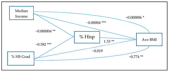 Path analysis for Hispanic ethic concentration on average BMI; * = 0.05; ** = 0.01; *** = 0.001.