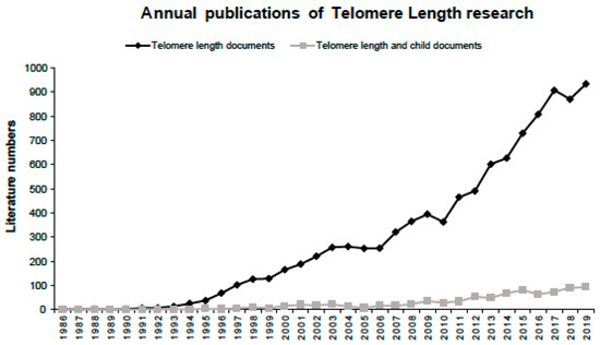 Annual distribution of publications on all telomere length research and telomere length in children research.