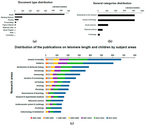 Distribution of the publications on telomere length in children by document type (a), general categories (b), and subject areas (c) over the period from 1991 to 2019.