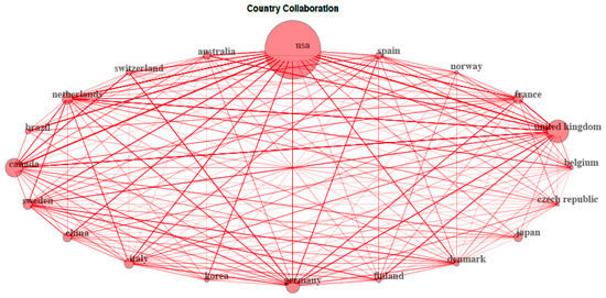 Country collaboration network map. Each link shows a collaboration between two countries and larger circle size indicates a higher number of international collaborative projects conducted by each country.