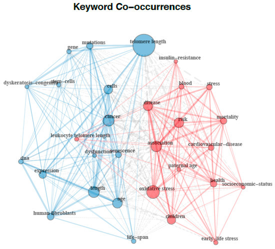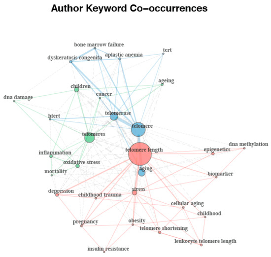 The analyses of the 30 most frequently used terms included in all the retrieved documents using the author keywords and the keyword plus terms (i.e., keywords associated to the manuscript by Thomson Reuters’ Institute for Scientific Information (ISI) WOS databases) are displayed in Figure 5 and Figure 6, respectively. A total of 1403 author keywords were retrieved, appearing 2503 times overall. The 30 most frequently used author keywords occurred from a minimum of seven to a maximum of 667 times. Based on the higher frequency of keywords and the proximity of their connections, as reflected by the larger size of nodes and the thickness of lines respectively, network analysis of the author keyword co-occurrences revealed a structure of links between keywords divided into three different clusters (Figure 5). The author keywords or terms with the highest occurrence were telomere length (n = 138), telomere (n = 97), telomeres (n = 56), telomerase (n = 49), aging (n = 43), children (n = 28), and stress (n = 22). A total of 2176 keyword plus terms were encountered and showed a maximum of 6301 times. The 30 most frequently used keyword plus terms were found from a minimum of 24 to a maximum of 1681 times. As shown in Figure 6, two clusters resulting from the network analysis of the keyword co-occurrences were identified as knowledge structure of research on telomere length in children. The keyword plus terms used with the highest frequency were telomere length (n = 156), cancer (n = 102), association (n = 100), length (n = 95), oxidative stress (n = 93), age (n = 87), risk (n = 85), disease (n = 83), cells (n = 78), and children (n = 65).