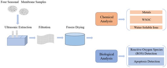Quartz filters containing PM2.5 were cut into small strips and placed into ultrapure water. The samples were treated using ultrasonic extraction in an ice bath for 20 min and repeated 3 times to extract the PM2.5 [,]. Different filters of the same season were extracted, vacuum freeze-dried and pooled to have a homogeneous batch of particles, representative of the sampling season. Part of the dried samples were suspended in a phosphate-buffered saline (PBS) solution and stored at 4 °C for the cytotoxicity tests. Other dried samples were stored at −80 °C. Figure 1 shows the schematic of the experimental design.
