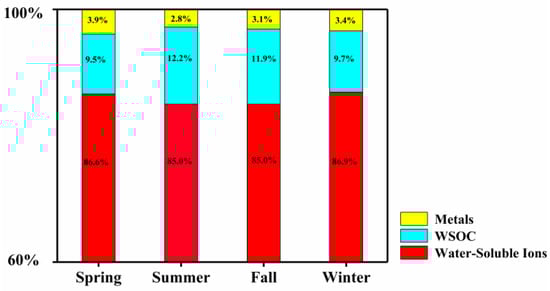 Organic carbon is an important part of organic aerosol, which accounts for 10–70% of the total PM2.5 mass []. A large proportion of organic carbon (20–60%) is water-soluble []. In this study, the WSOC sourced from the four seasons accounted for 9.5–12.2% of all species tested. Our previous measurement in Nanjing (May 2015 to May 2016) also showed a relatively low level of WSOC, which may be related to the emission sources []. Our results are comparable to those found in other cities, in that organic carbon made up 5.7–8.4% and 10.0% of the PM2.5 in Thessaloniki (Greece) and São Paulo (Brazil) [,], respectively. In addition, the WSOC had the highest proportion in the summer and fall, followed by winter and spring. Similar measurements were also reported in our previous study []. High temperatures and strong sunlight facilitate the production of secondary organic aerosols, which may explain the increased organic carbon proportions in the summer []. It should be noted that only the WSOC components were detected in this study; the specific species of carbon-containing organic matter in the PM2.5 have not been distinguished.
