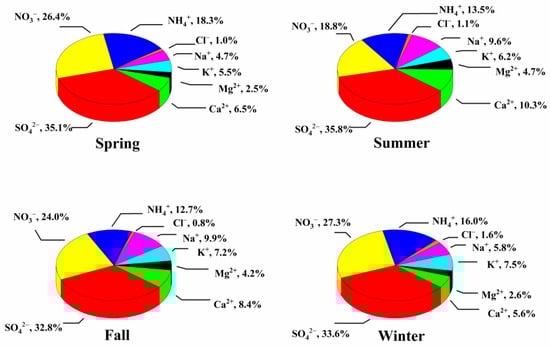 Water-soluble inorganic ions are another important chemical compositions of PM2.5. In this study, the percentage of water-soluble ions to total PM2.5 mass was the highest in winter (67.4%), followed by spring and summer (59.7% and 37.2%, respectively), and the lowest in fall (33.9%). This may be related to the unfavorable meteorological diffusion conditions in winter []. Further, these values in Nanjing were higher than those in Xiamen (28.7%), but comparable to those in Shenyang (55.9%) or Shanghai (55.9%) [,,]. Since they come from different sources, their contents can be used to reflect the origin of the particles []. Generally, SO42− is a secondary pollutant produced from sulfur dioxide. NO3− mainly comes from the conversion of its gaseous precursor, NOx. NH4+ is also an indicator of secondary pollution, and is mainly formed by the emission of NH3. Cl¯, K+ and Mg+ are often derived from the combustion emission of power plants and incinerators. Besides, K+ can be used as a marker of biomass combustion. Ca+ usually comes from soil sources, and it is often used as a marker of construction dust.