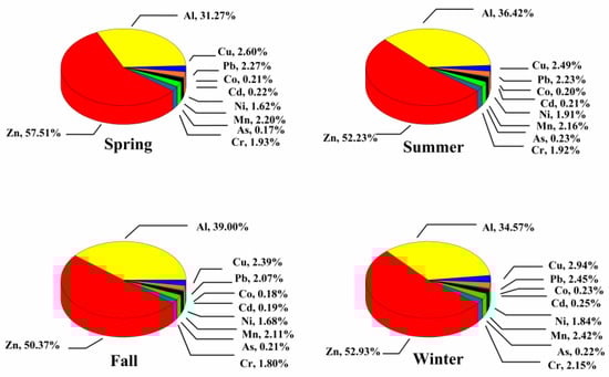 Different contents and species of metals have been found in PM2.5, which may be caused by different PM2.5 sources and environmental conditions []. Among all the measured metals, Al and Zn were the main elements in the PM2.5 samples of all four seasons, and accounted for more than 80% of the total metals. Al is a representative element of the crust source, while Zn mainly comes from fuel combustion and diesel engine emission []. Other elements can also indicate different sources, such as Pb is from coal combustion and motor vehicle exhaust; Cu is from coal combustion, industrial emission, motor vehicle tires and mechanical wear; and As is from coal-fired emissions, as well as metallurgical and chemical industries [,]. In this study, high proportions of Zn, Pb, As and Cu were found in PM2.5, which was related to the fact that our sampling site is located in a traffic pollution area near chemical plants. Further, the percentage of heavy metals in the spring and winter samples were higher than those in the summer and fall samples. Unfavorable diffusion conditions aggravated the metal pollution in winter, while the low PM2.5 mass enhanced the proportion of heavy metals in spring.
